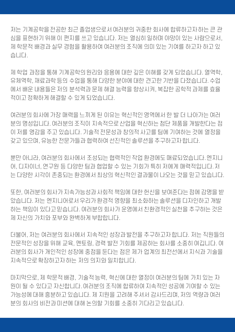 저는 기계공학을 전공한 최근 졸업생으로서 여러분의 귀중한 회사에 합류하고자 하는 큰 관심을 표현하기 위해 이 편지를 쓰고 있습니다. 저는 열심히 일하며 야망이 있는 사람으로서, 제 학문적 배경과 실무 경험을 활용하여 여러분의 조직에 의미 있는 기여를 하고자 하고 있습니다.