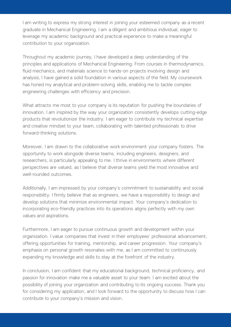 I am writing to express my strong interest in joining your esteemed company as a recent graduate in Mechanical Engineering. I am a diligent and ambitious individual, eager to leverage my academic background and practical experience to make a meaningful contribution to your organization.
