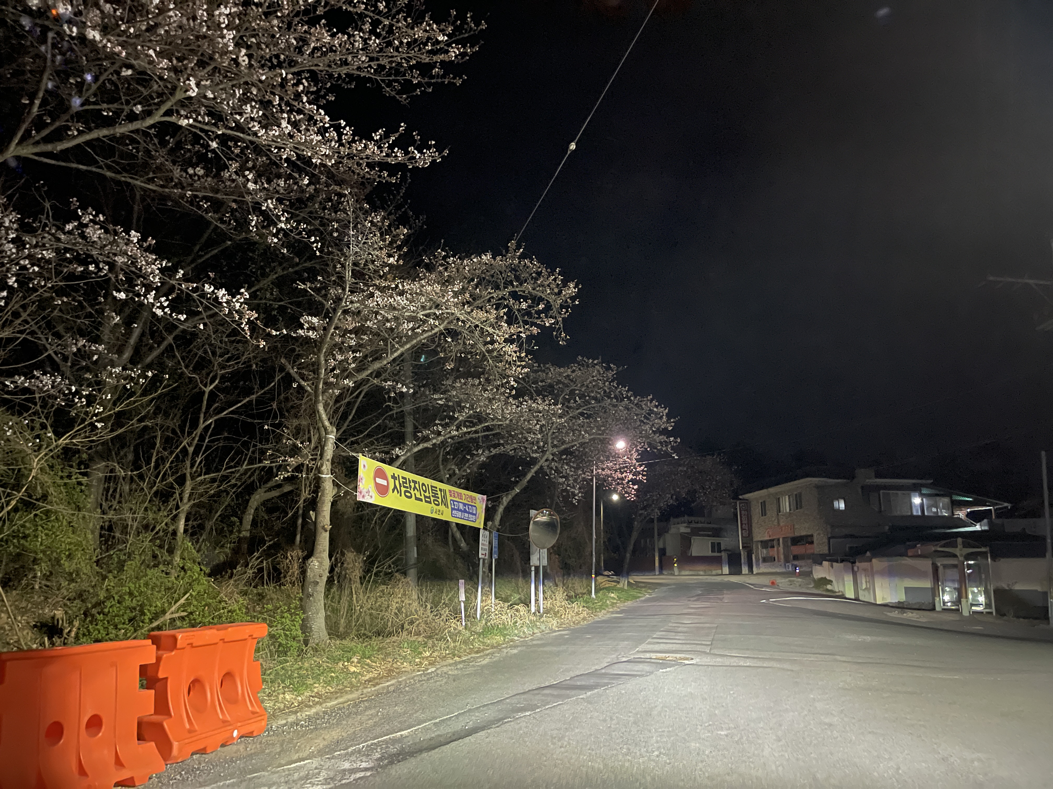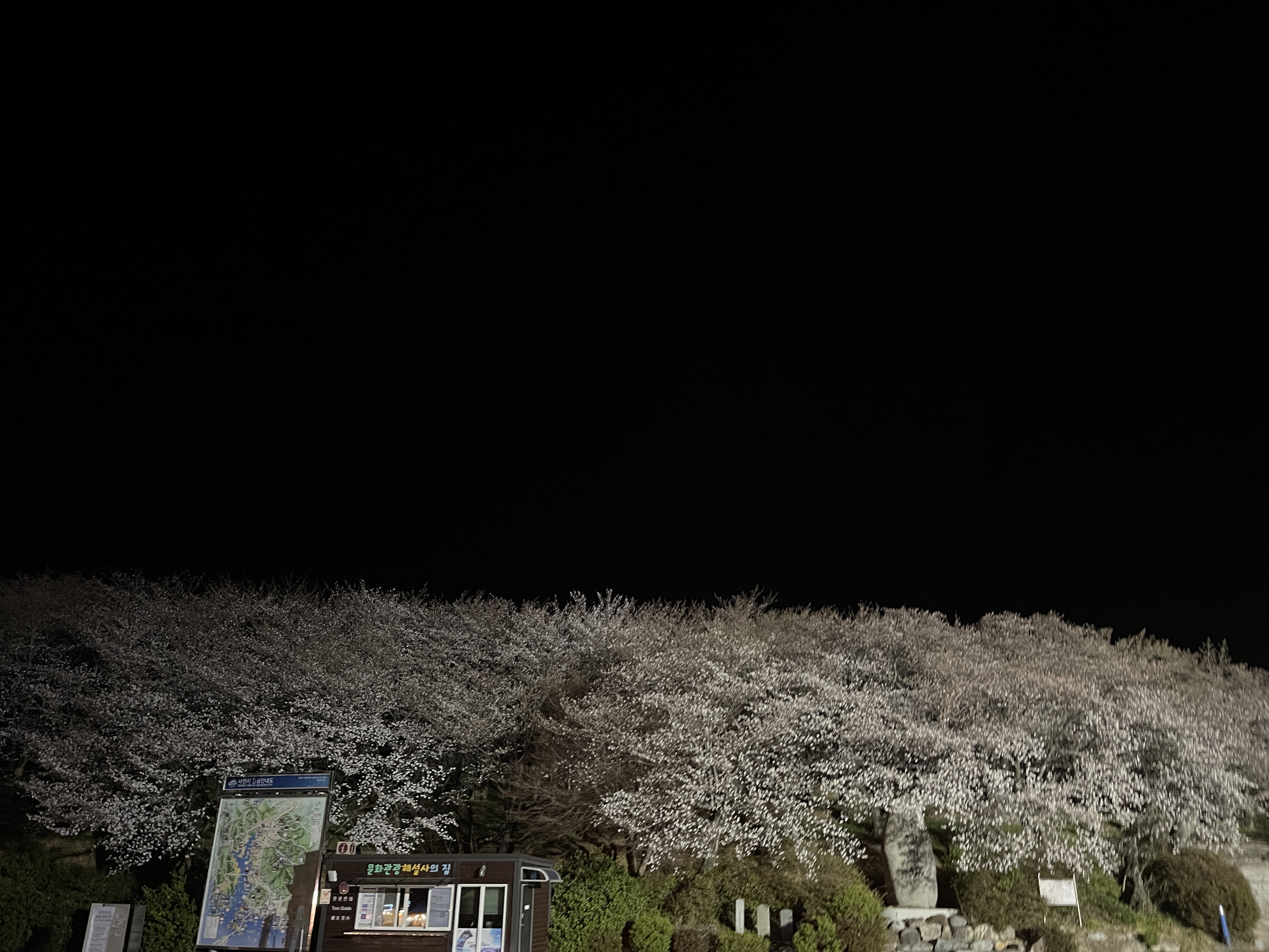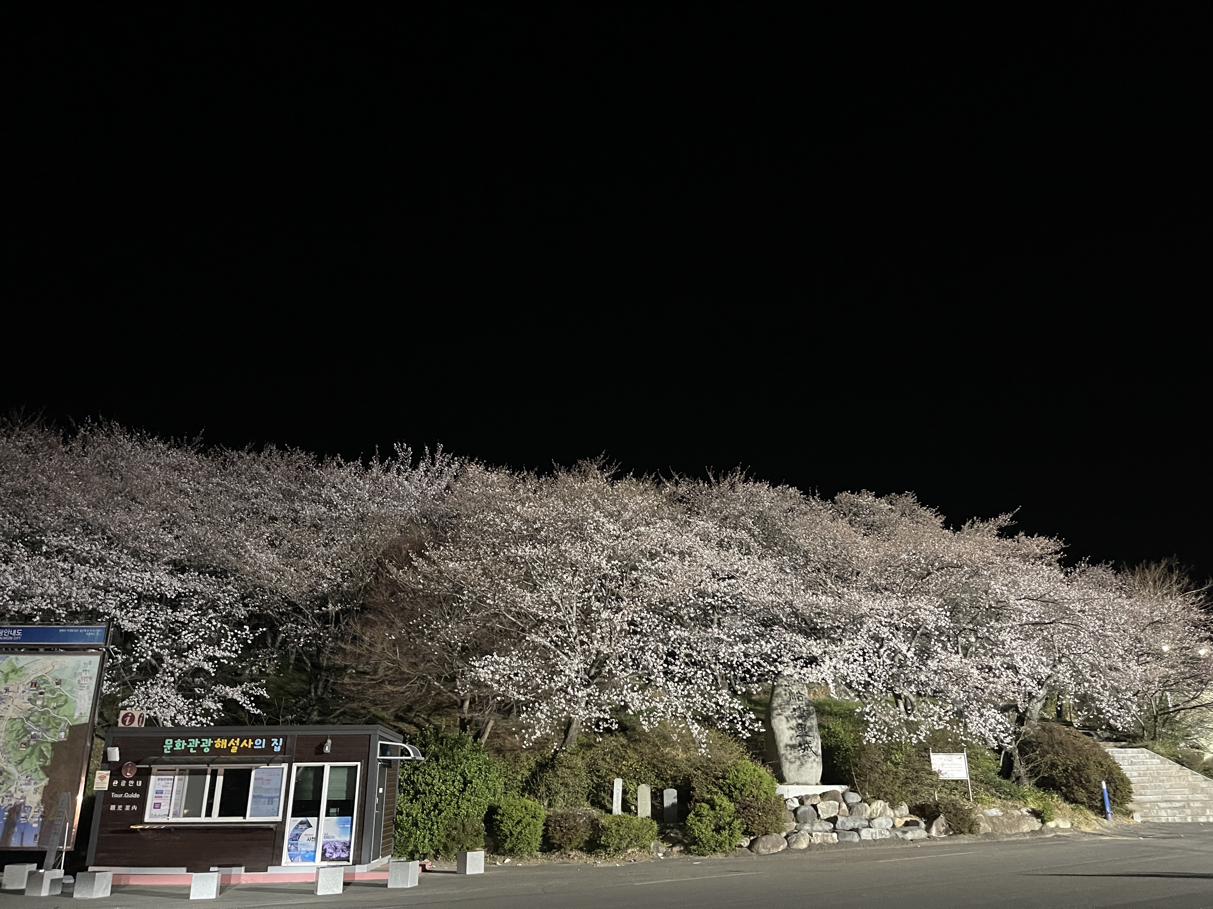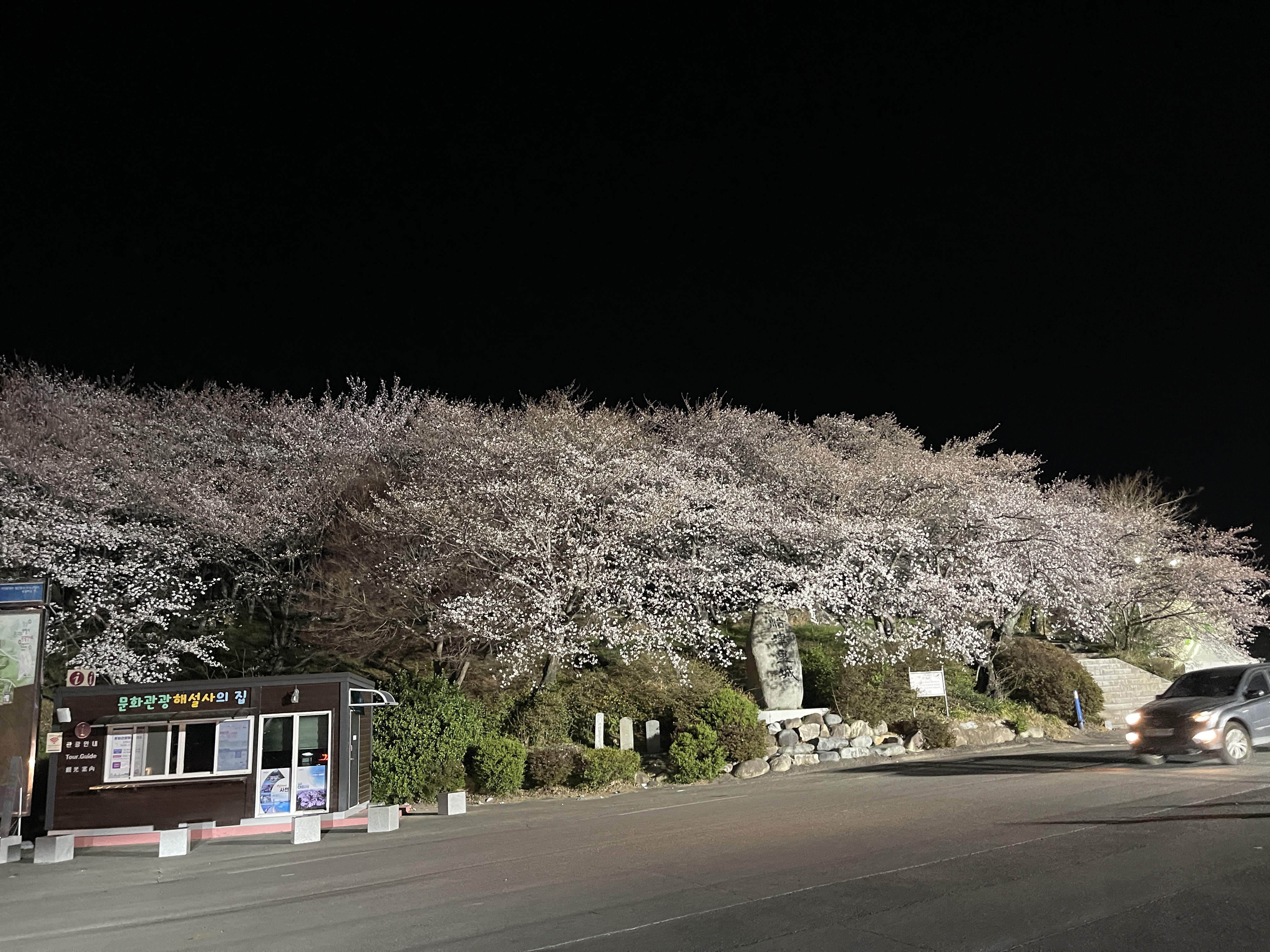 ▲ 2025년 3월 말, 사천 선진리성 야간 벚꽃 개화 모습 (직접 촬영)