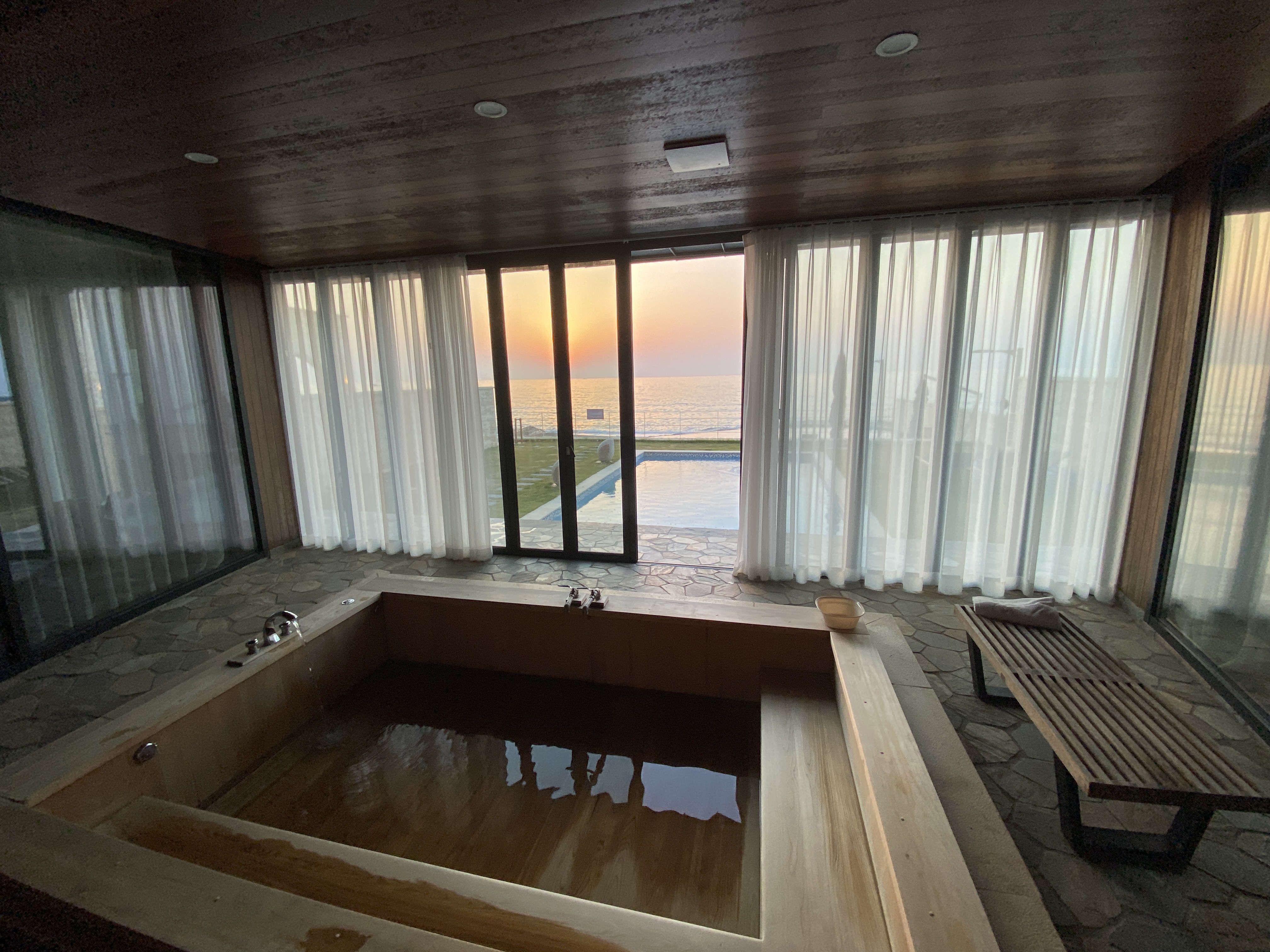 일출 바라보면서 히노끼탕에서 아침을 맞이하는데, 그 피로가 쫙 풀렸어요.