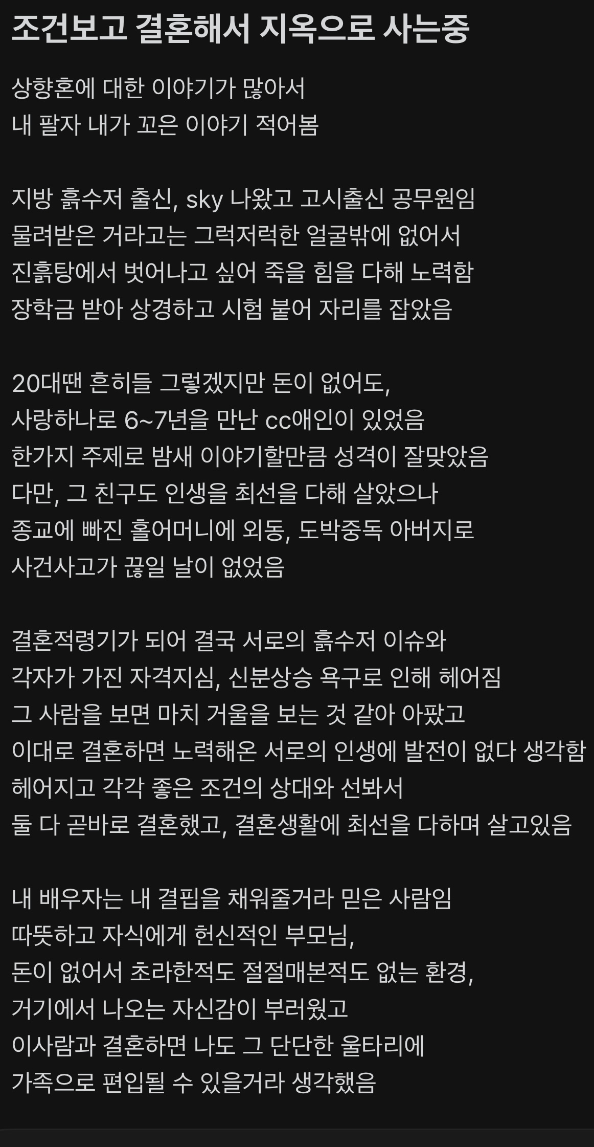 조건 보고 결혼해서 지옥을 살고 있다는 말.