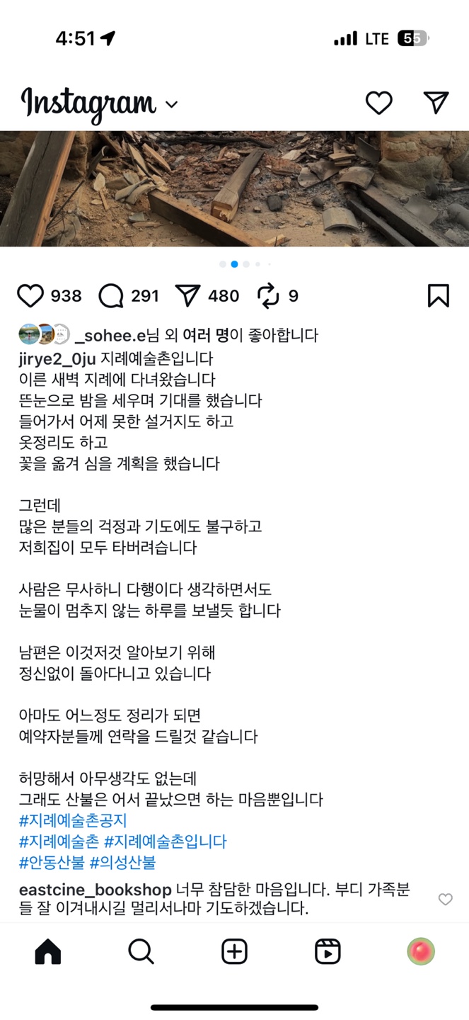 오늘 우연히 SNS에서 지례예술촌 산불 소식을 접했습니다.