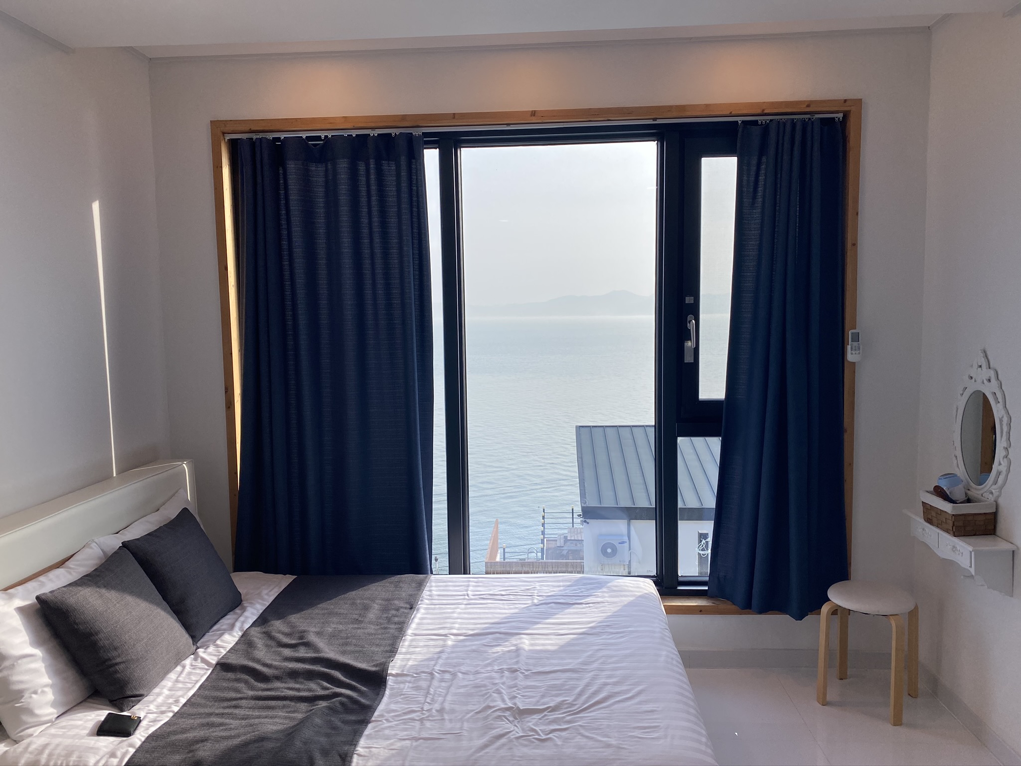 왜냐면 삼천포 앞바다는 작지만 이쁜 노을과 실안 해안도로를 따라가다 보면 꼭 드라마나 영화에서 볼 듯한 사람 사는 냄새가 나는데, 남해 앞바다는 탁 트인 시야에 한 편의 그림을 보는듯 해서 자기전, 아침에 눈 뜨기 전까지 창문을 바라보는게 너무 좋았다.