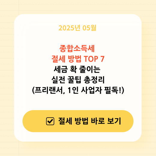 | [종합소득세 절세 방법 TOP 7] 세금 확 줄이는 실전 꿀팁 총정리 (프리랜서, 1인 사업자 필독!) (5) | 2025.04.15 |
