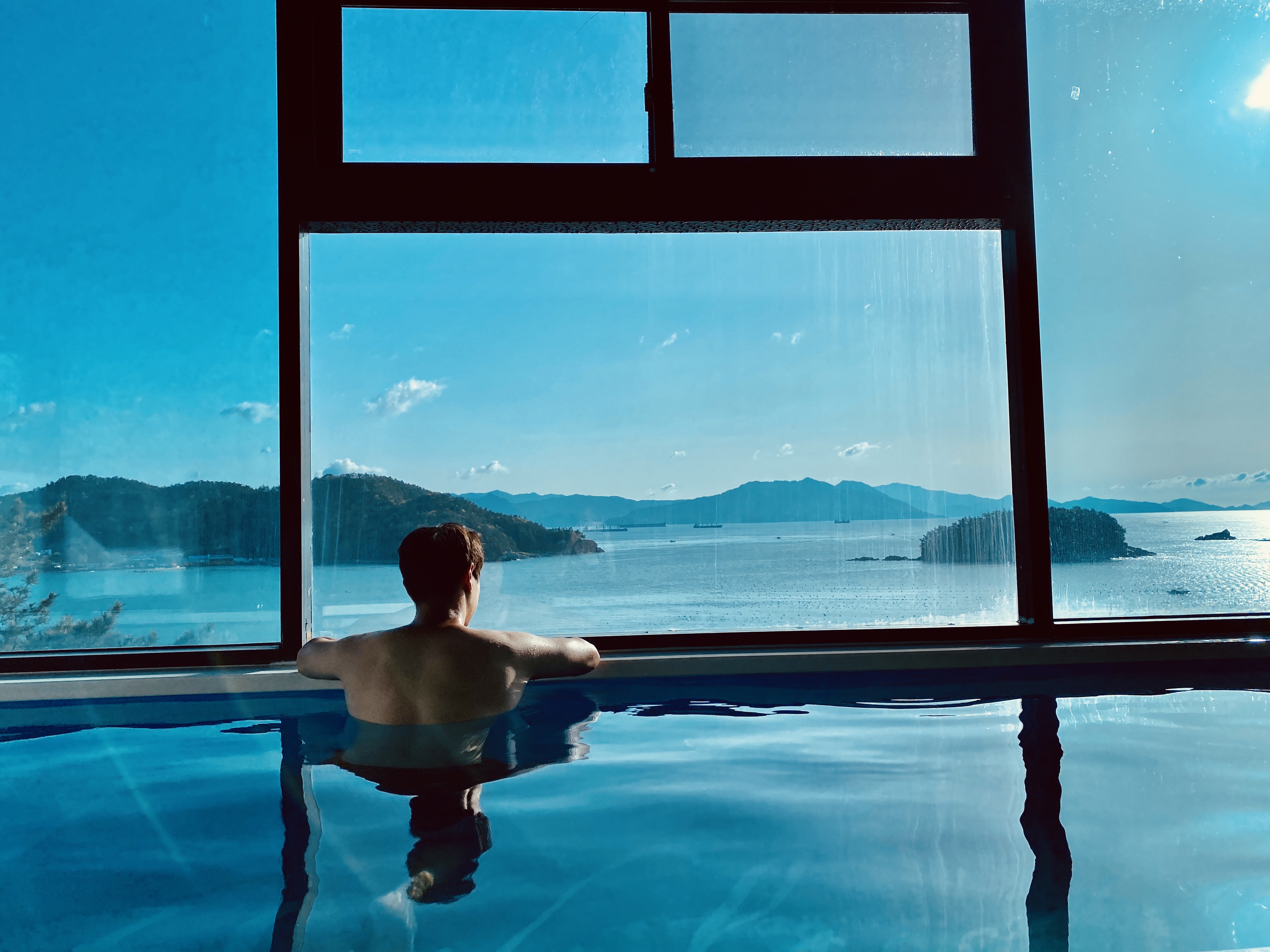 정면에는 해수로 채워진 수영장이 있다. 여기서 추가금액을 지불하면 온 종일 온수로, 아니면 생각보다 빨리 식는다.